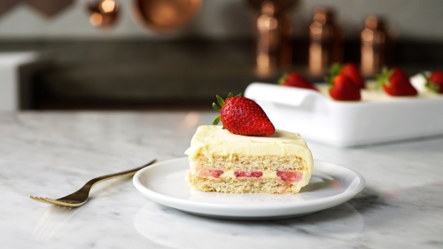 Finalizar com morangos picados cobrindo toda a travessa.